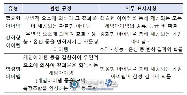 먼저, 확률형 아이템 유형을 캡슐형, 강화형, 합성형(컴플리트 가챠 포함)으로 구분하고, 각각의 유형에 따른 의무 표시사항을 규정했다. 또한, 특정 시행 결과가 다른 시행 결과에 영향을 미치는 방식(독립시행이 아닌 경우), 이용 조건에 따라 게임 아이템을 확정적으로 얻을 수 있는 방식(천장제도) 등에 대해서도 공급 정보를 표시하도록 했다. 이는 그동안 자율규제에 적용되어 온 기준을 기반으로 게임이용자들의 의견을 추가 반영한 것으로 이번 개정안을 통해 게임이용자들의 알 권리가 대폭 확대될 것으로 기대된다.