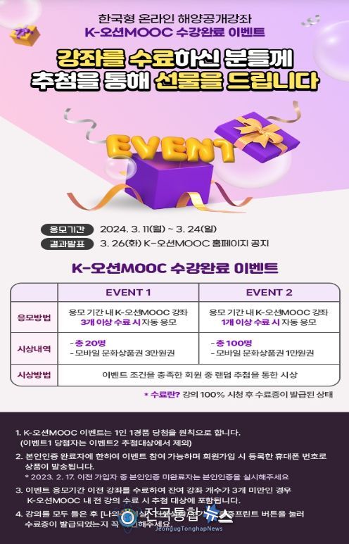 전국통합뉴스 진홍식 기자 | 해양수산부는 누구나 무료로 바다를 주제로 한 강연을 들을 수 있는 온라인 공개강좌 누리집(K-오션MOOC)에 신규 강좌 업로드를 기념하여 3월 11일부터 수강자를 대상으로 이벤트를 개최한다. 3월 11일부터 3월 24일까지 총 14일간 강좌 1개 이상 수료자 중 추첨을 통해 모바일 기프티콘도 제공하며, 자세한 내용은 누리집을 통해 확인할 수 있다.