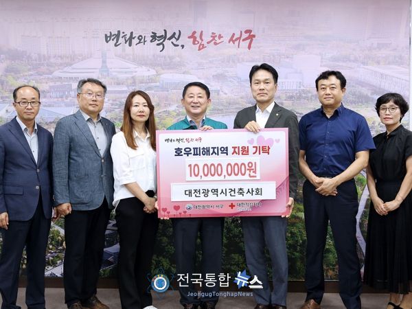전국통합뉴스 이종구 기자 | 대전 서구는 지난 31일 구청 갑천누리실에서 대전광역시건축사회와 관내 호우피해 지역 구호 성금(1,000만 원) 기탁식을 가졌다.