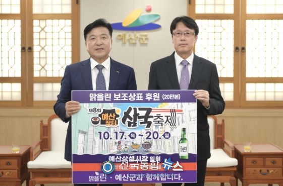 전국통합뉴스 임명락 기자 | 예산군과 ㈜선양소주는 군청 상황실에서 최재구 예산군수와 강재규 ㈜선양소주 영업본부장 등이 참석한 가운데 군 대표 축제인 ‘제8회 예산장터 삼국축제’의 홍보를 위한 ‘맑을 린’ 소주 홍보라벨 전달식을 진행했다고 11일 밝혔다.