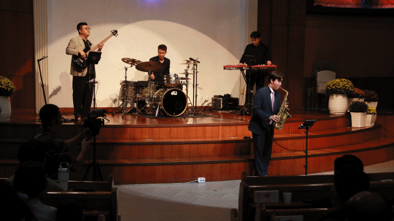 양왕열 퀄텟은 먼저 ▶'주 하나님 지으신 모든세계'를 감미로운 색소폰 연주로 본당을 가득채웠다. 이후 드럼과 베이스기타, 피아노가 함께 어우러져 관객들의 호응을 얻기 시작했다.