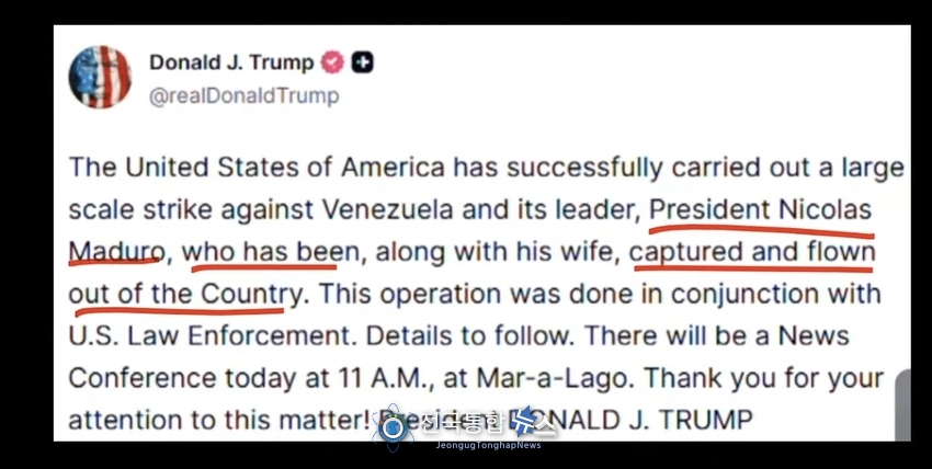 미국은 베네수엘라와 그 지도자 니콜라스 마두로 대통령을 상대로 대규모 공격을 성공적으로 수행했습니다. 마두로 대통령은 그의 아내와 함께 체포되어 베네수엘라 국외로 이송. 이번 작전은 미국 법 집행기관과의 공조 하에 이루어졌고 자세한 내용은 공개될 예정. 오늘 오전 11시, 마라라고(Mar-a-Lago)에서 기자회견이 열릴 예정. 관심에 감사드립니다. 대통령 도널드 J. 트럼프